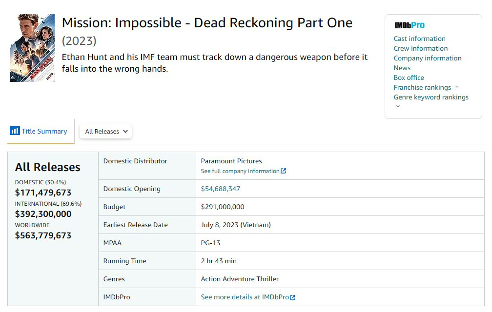 9月13日,《碟中谍7:致命清算(上)》内地正式落画,上映62天票房3.49亿。目前影片全球票房5.64亿美元,创下十年来系列最低。