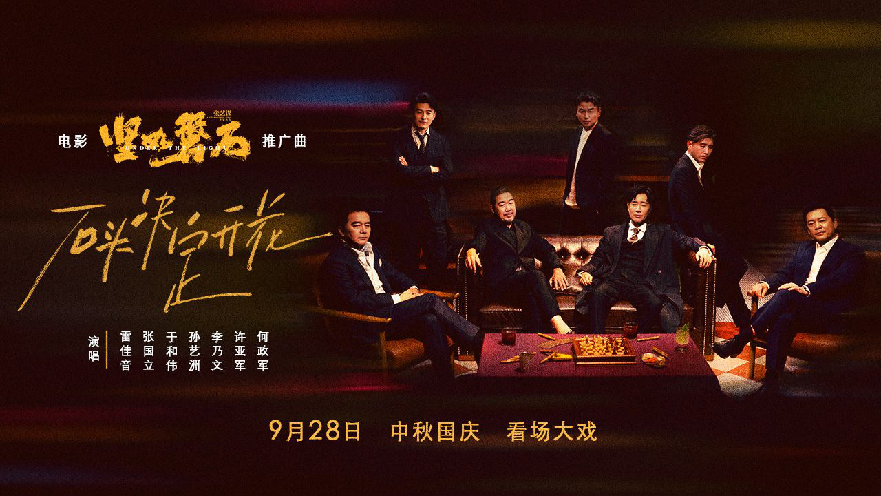 9月15日,张艺谋国庆档新片《坚如磐石》发布推广曲《石头决定开花》,由雷佳音、张国立、于和伟、孙艺洲、李乃文、许亚军、何政军特别献声,歌曲以“石头”作为表征,以“石”喻角剖析角色深处的初心与挣扎。看似随处可见的石头,却历经岁月磨砺而不改初心,葆有盛开的活力,在不止黑白的世界里冲破桎梏,开出属于自己的花,一如电影《坚如磐石》历经四年磨砺,终于开花与观众相见。