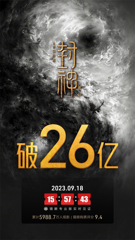据猫眼专业版数据显示,截至9月18日15时57分,电影《封神第一部》总票房破26亿,累计观影人次达5988.7万人。影片的豆瓣评分上涨至8.0,超过87万人为影片打分。此外,《封神第一部》宣布将于9月21日网播上线,院线密钥延期至10月19日。