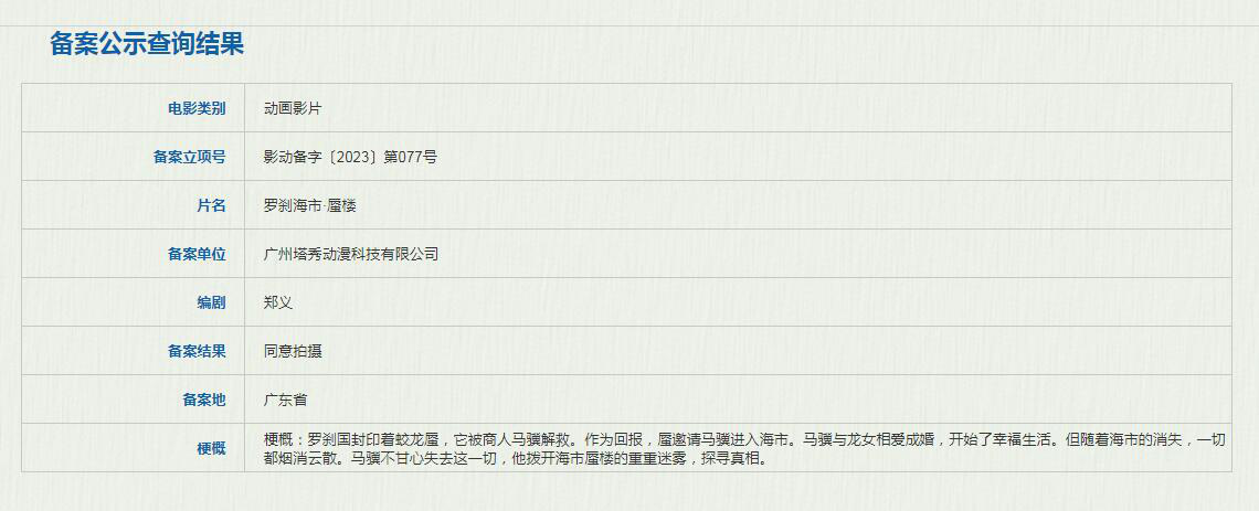 近日,国家电影局发布关于2023年8月上全国电影剧本(梗概)备案、立项公示的通知。一部名为《罗刹海市·蜃楼》的国产动画正式立项。