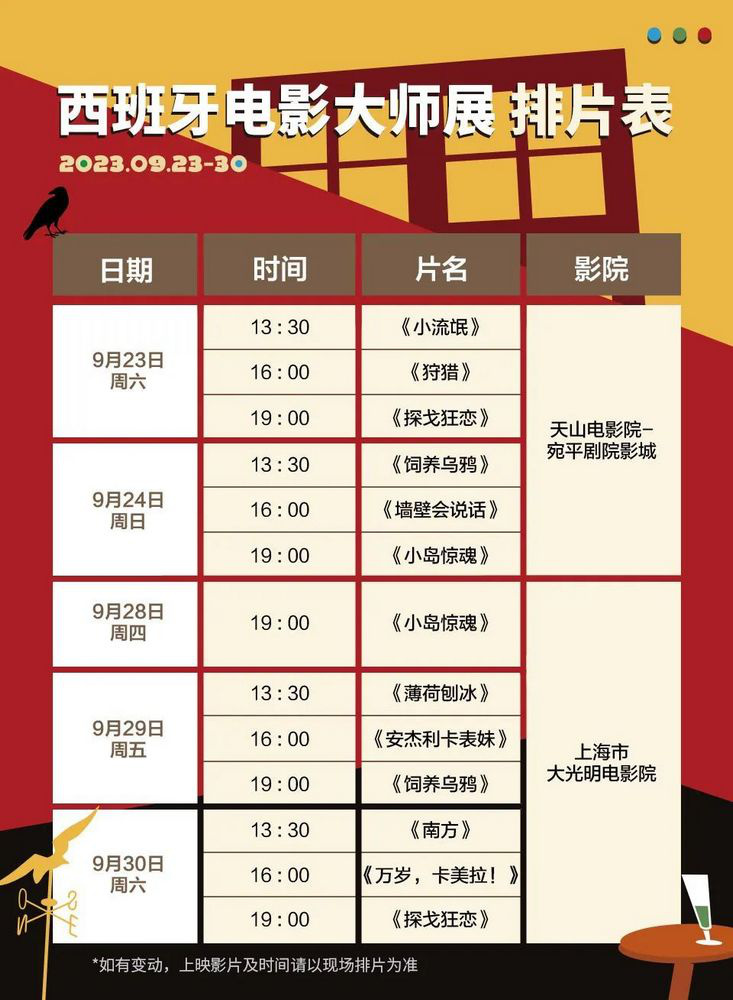 由上海市电影局指导、上海国际影视节中心特别策划的“西班牙电影大师展”本周末起将在上海举行。此次共放映三位西班牙大师的作品,共计十部影片将于9月23日、24日、28日、29日、30日在上海与影迷见面。