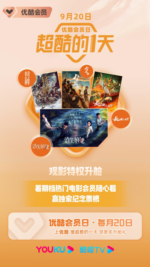 9月20日,优酷会员日「超酷的一天」再次开启,权益升舱,惊喜加码,超值福利,重磅来袭!会员独家观影特权、院线影片随心享受、会员权益一键升舱,享不够,看不完,领不停!这波真的是排面拉满,令人心动满分!