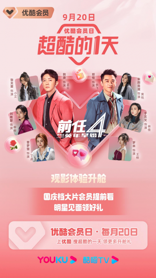 国庆档大片超前观影,明星主创亮相互动。九月优酷会员日,举办《前任4:英年早婚》优酷会员专场,招募会员用户专享超前观影福利。活动更邀请到韩庚、郑恺等明星主创到场,让优酷会员不仅能和主创明星近距离见面进行互动,还能领到优酷会员准备的专属伴手礼,会员观影体验再升舱,和“前任团”度过「超酷的一天」。