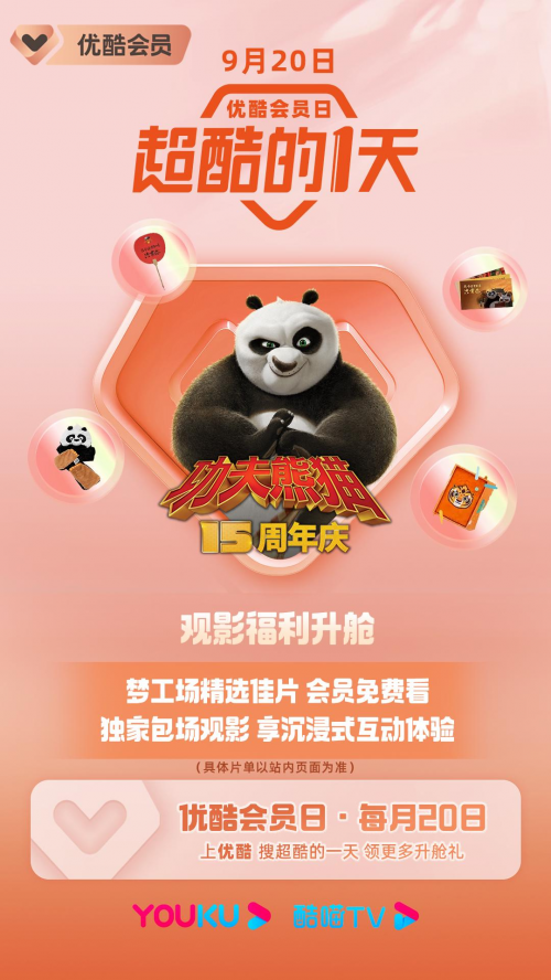 本月会员日,优酷会员联动优酷电影,为会员提供专属的观影福利,国庆档大片会员抢先看、暑期档热门电影会员随心看,以及值逢功夫熊猫15周年,还推出了“梦工场精选佳片会员免费看”。专属观影福利惊喜加码,会员观影特权强势来袭!