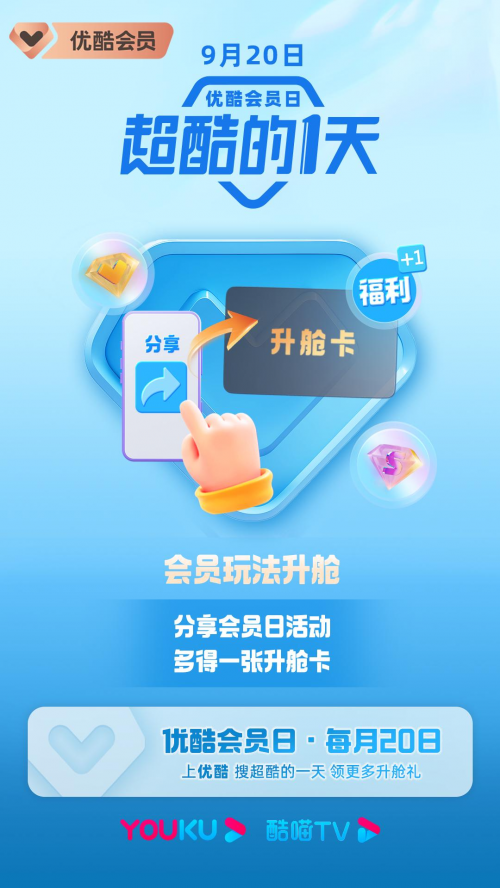 9月20日-9月25日,优酷会员打开优酷APP,搜索「超酷的一天」,进入活动页面即可领取升舱卡。优酷VIP会员可享免费直升优酷SVIP会员权益,与此同时,优酷SVIP会员领取升舱卡,即可免费随机领喜马拉雅、酷狗音乐、必胜客任一品牌月卡。并且分享活动页面即可获得再升舱机会,福利再加码!