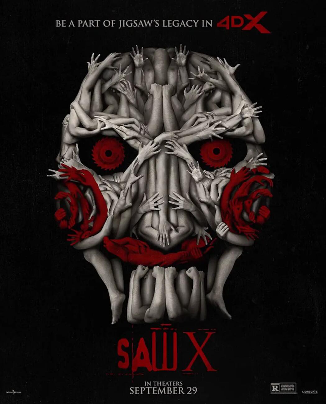 热门恐怖片系列新作《电锯惊魂10》公布了4DX版本海报。在海报上,人类的肢体组成了竖锯的样貌,远远看去密集恐惧症的不适感十足。海报上的宣传语写着“成为竖锯遗产的一部分”更是令人毛骨悚然。