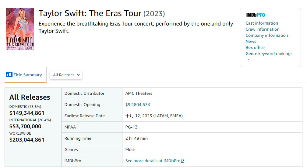 泰勒·斯威夫特巡演电影《泰勒·斯威夫特:时代巡回演唱会》全球票房突破2亿美元,本片制作成本为1500万美元,成为今年最赚钱的电影之一。
