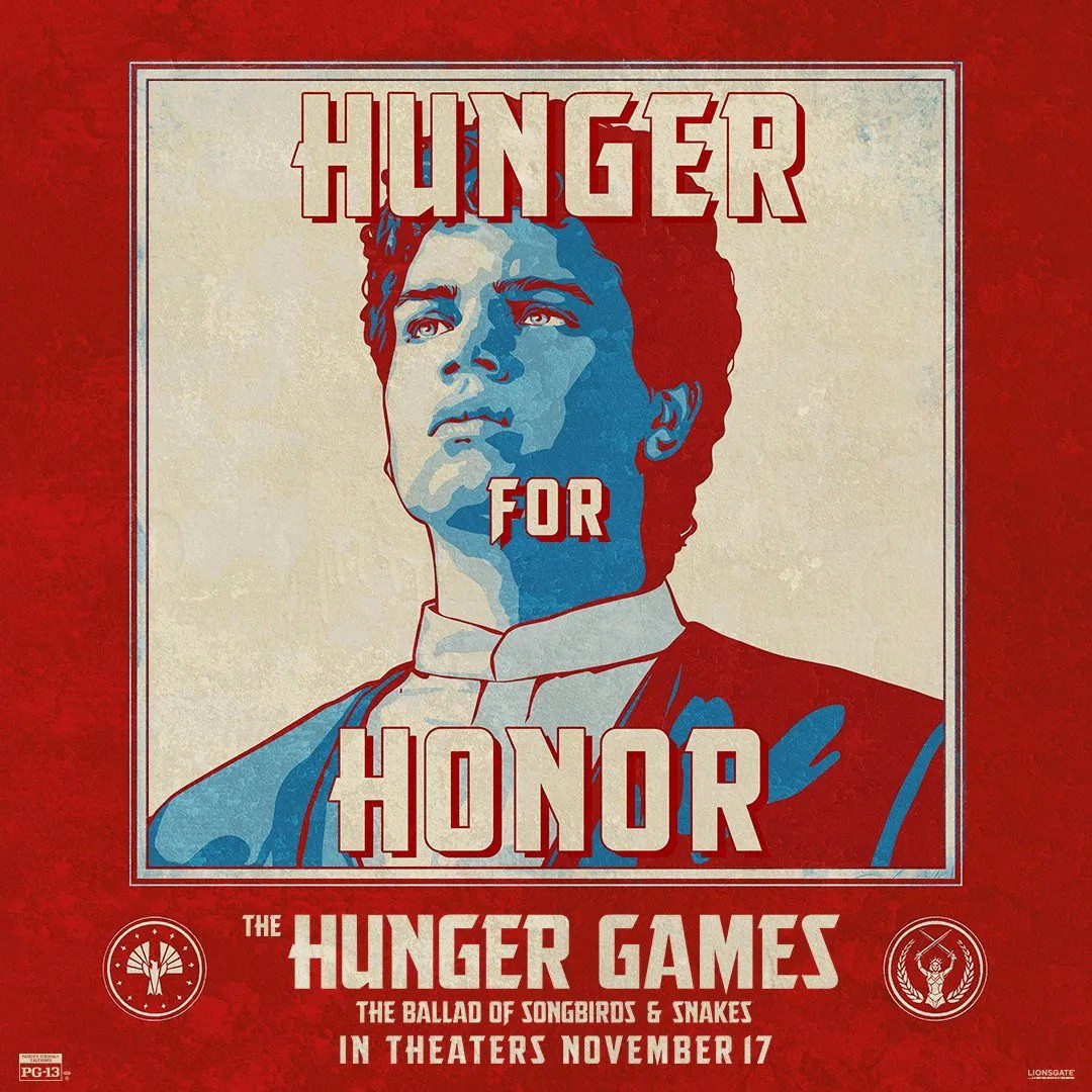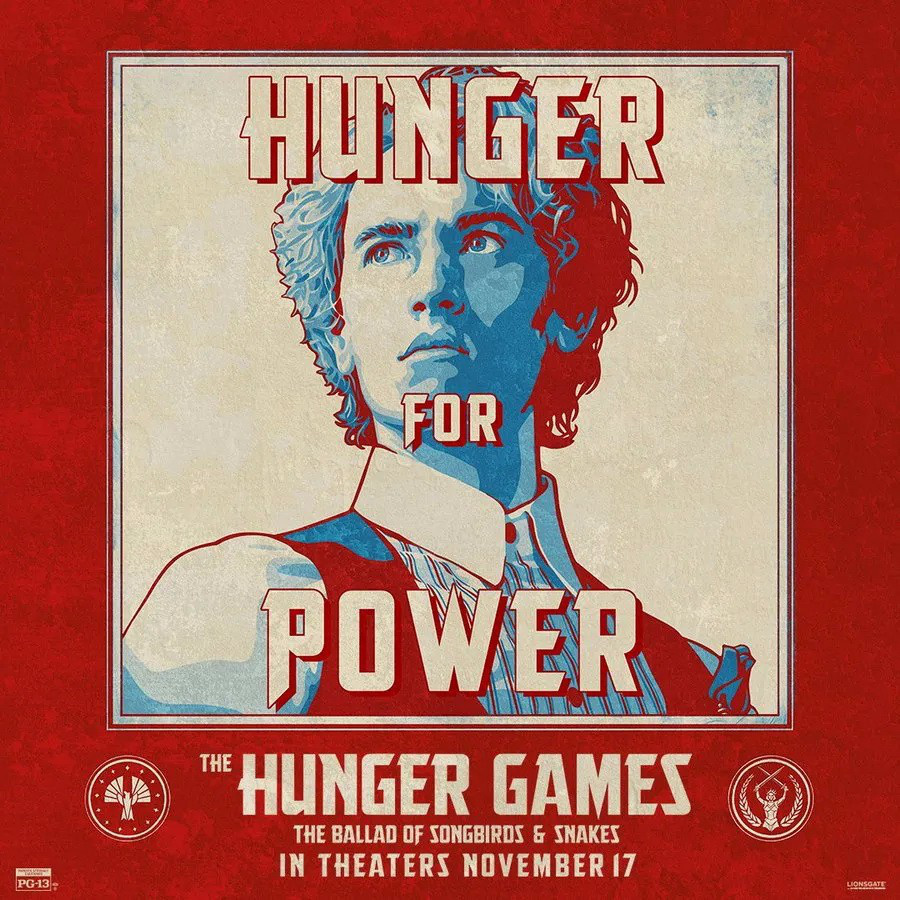 这组海报暗合了影片的故事情节,每个人物都是“饥饿游戏”的宣传者。在海报上写着“渴求自由”、“渴求权力”、“渴求控制”、“渴求改变”、“渴求荣耀”、“渴求真相”、“渴求名气”的字样。影片改编自原作者苏珊·柯林斯的同名新书,设定在科里奥兰纳斯·斯诺成为施惠国暴君总统的数年前,18岁的斯诺英俊迷人,虽然家族衰落处境艰难,他看到一个改变命运的机会:他被选中成为第十届饥饿游戏的导师。斯诺被派去指导来自贫困第12地区的女孩露西·格雷·贝尔德,后者在收割仪式上挑衅地唱歌,引起所有人的注意。《饥饿游戏》系列导演弗朗西斯·劳伦斯回归执导前传,最新版剧本由迈克尔·莱斯利编写,迈克尔·阿恩特参与创作。