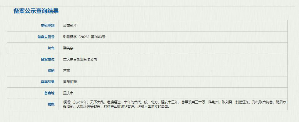 据国家电影局关于2023年9月上全国电影剧本(梗概)备案、立项公示的通知,芦苇编剧新作《群英会》立项备案,备案单位为重庆来喜影业有限公司。