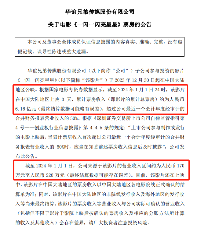 1月2日晚,A股上市公司华谊兄弟发布了关于电影《一闪一闪亮星星》票房的公告。该公告显示,截至2024年1月1日24时许,该影片在中国大陆地区上映3天,累计票房6.16亿元时,公司源于该片的营收收入约为人民币170万元至人民币220万元。