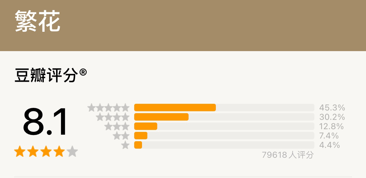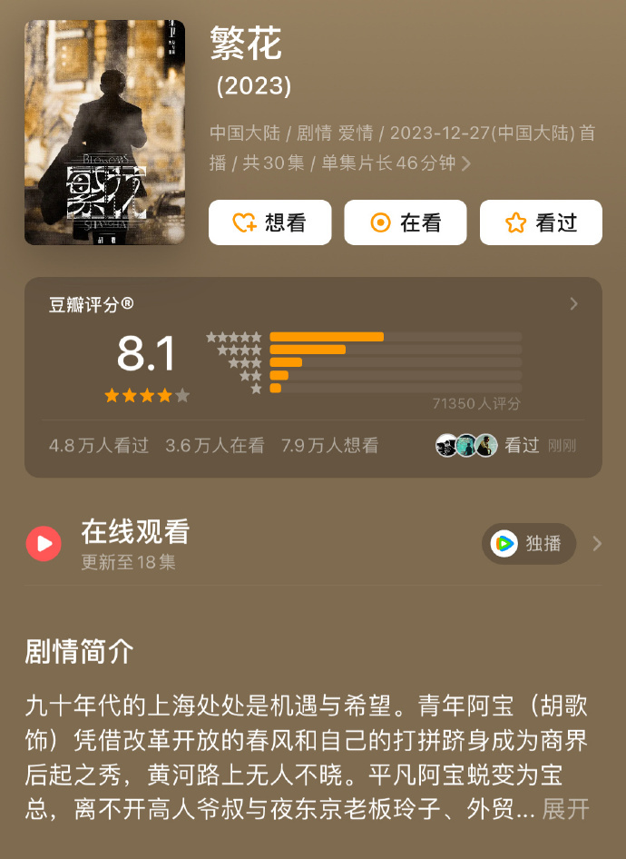 1月4日,王家卫执导首部电视剧《繁花》豆瓣开分8.1分,近8万人打分,4星-5星占比75%,口碑爆棚。据猫眼数据统计,该剧全网热度连续8天登顶,猫眼角色热度榜前六名独占其三,微博热度也居高不下,数次上榜热搜,累计话题729次超120次登顶热搜Top1。