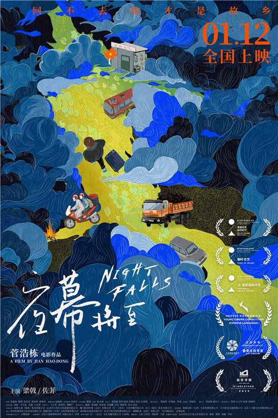 《夜幕将至》导演菅浩栋1989年生于山西,现为坏猴子影业签约导演,本片源于导演个人的真实生活经历。电影中,离乡多年的梁哲回到山西老家,准备参加爷爷的丧礼,可是回家的路实在漫长。