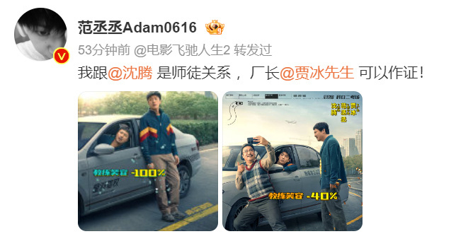 沈腾、范丞丞在电影《飞驰人生2》中饰演一对天才师徒赛车手,此前网友曾猜测两人在片中是父子关系,今日《飞驰人生2》发布新海报后,范丞丞在线澄清:“我跟沈腾是师徒关系,厂长贾冰可以作证!”在线辟谣与沈腾是父子关系,活宝师徒的组合更让人期待了!