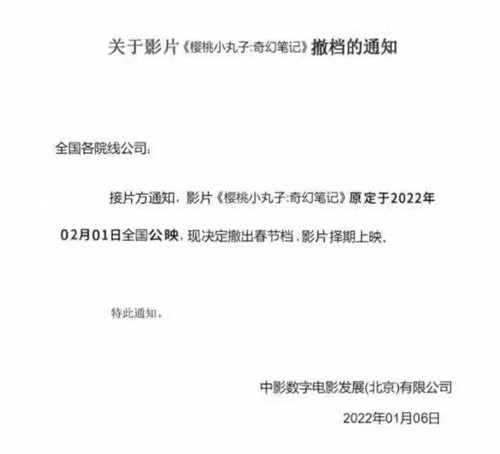 还有不到一个月的时间,2022年春节档即将拉开帷幕。1月6日下午,薛晓路导演的3D动画电影《樱桃小丸子:奇幻笔记》官宣将撤出春节档,影片档期将择日再定。