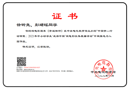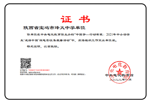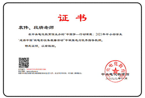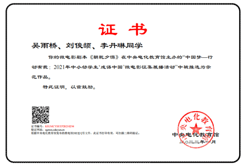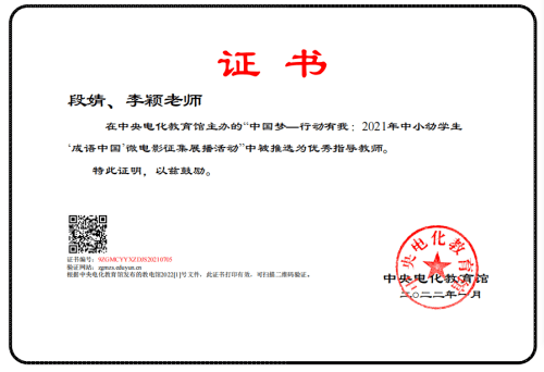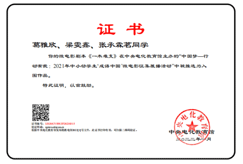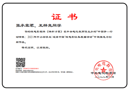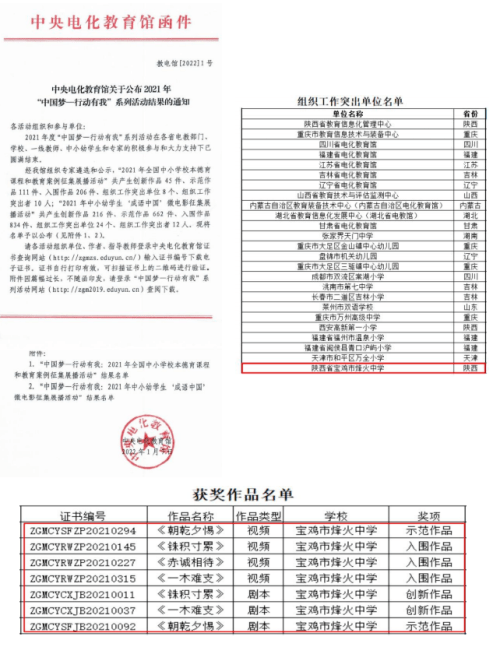 本次获奖的四部微电影作品均由我校师生创作拍摄,作品经渭滨区电教中心推荐,从全省众多参赛作品中脱颖而出,被省电教馆报送中央电教馆参评"2021年中国梦—行动有我:中小幼学生‘成语中国’微电影征集展播活动。经专家评审,《朝乾夕惕》获真人表演和剧本示范作品两个奖项;《一木难支》获真人表演入围作品和剧本创新两个奖项;作品《铢积寸累》获真人表演入围作品和剧本创新两个奖项;《赤诚相待》获真人表演入围作品1个奖项。