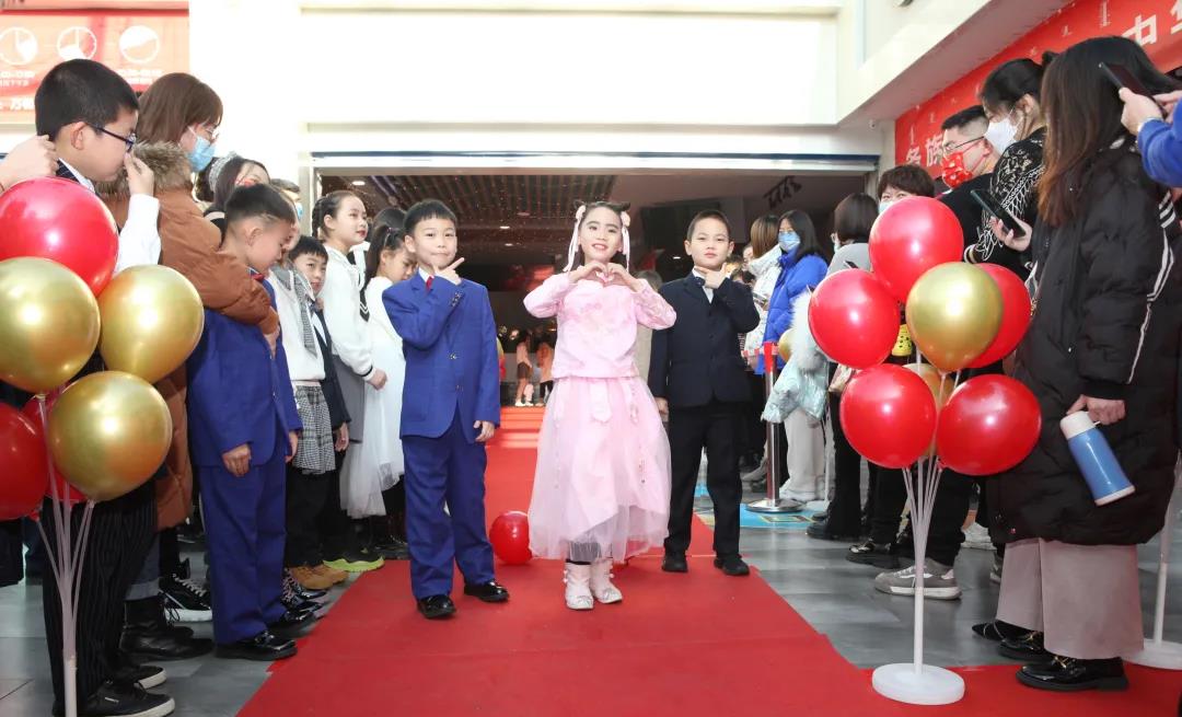 首映礼现场,参加演出的300名小演员身着礼服,迈着自信的步伐,依次走过红地毯,向前来观礼的观众展示自我,并在签名墙上签名。随后,小演员们和家长们走进影厅,观看影片。