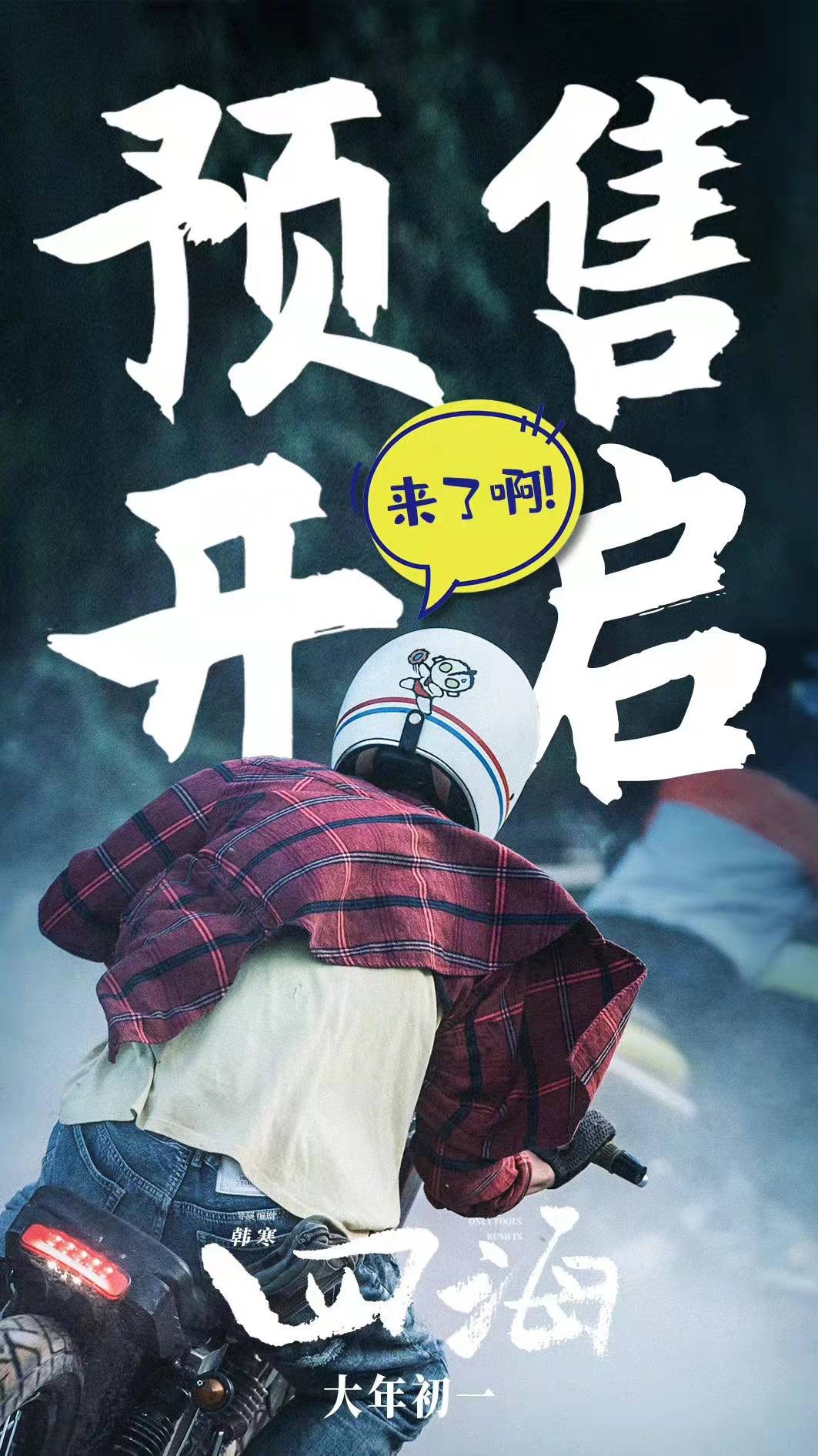 由韩寒导演,刘昊然、沈腾、尹正和刘浩存主演的影片《四海》也发布了一张新海报,画面上是刘昊然骑着摩托车,戴着一顶印有奥特曼肖像的头盔,给观众留下了一个潇洒的背影。海报上还写着“来了啊!”三个大字,十分有创意。