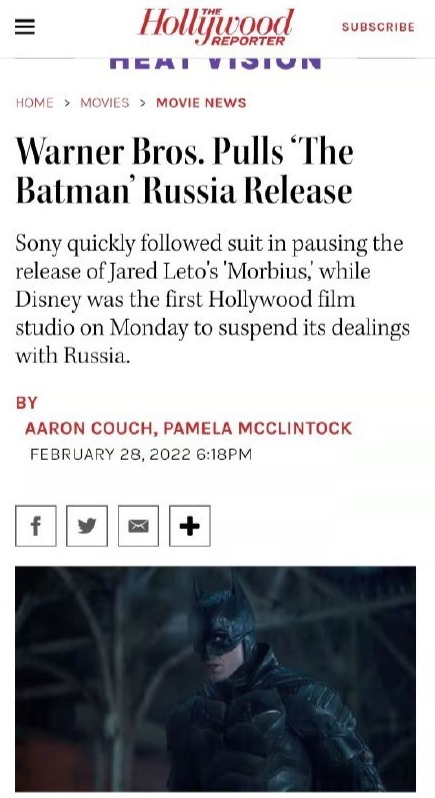 华纳传媒发言人在最新声明中表示:“鉴于乌克兰发生的人道主义危机,华纳传媒决定暂停在俄罗斯发行电影《新蝙蝠侠》。”