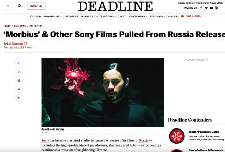 随后,索尼公司宣布暂停在俄上映《暗夜博士:莫比亚斯》(原计划于3月24日在俄上映)以及其他影片在俄罗斯的上映计划。
