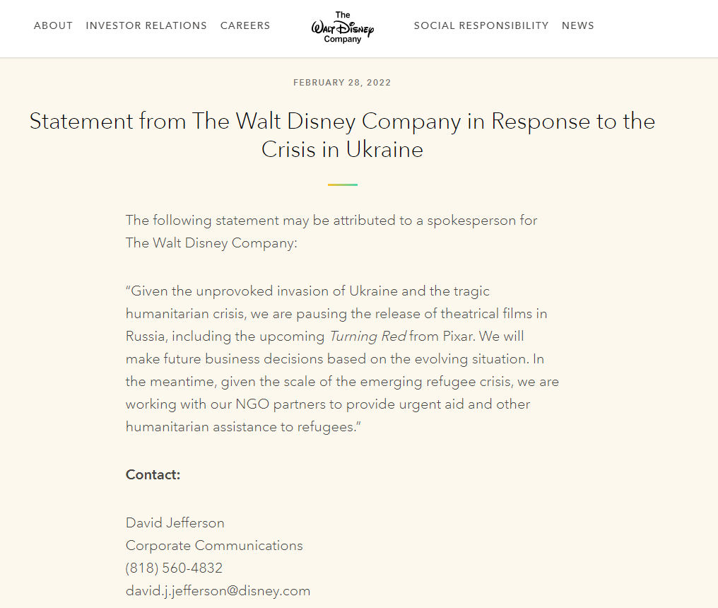 华特迪士尼公司在声明中强调:“鉴于俄罗斯对乌克兰的无端入侵和悲惨的人道主义危机,我们将暂停在俄罗斯上映戏剧电影,原定于3月10日在俄上映的动画电影《青春变形记》也不会如期与俄罗斯观众见面”,并表示“鉴于新出现的难民危机的规模,迪士尼公司正在与非政府组织合作,为难民提供紧急援助和其他人道主义援助。”
