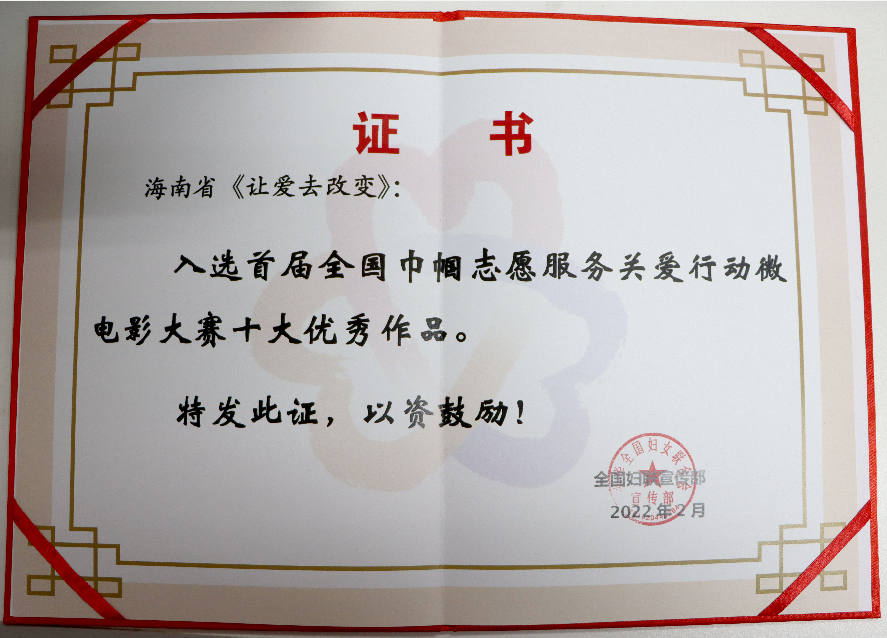 近日,全国妇联宣传部公布全国巾帼志愿服务关爱行动和征集展示活动获奖作品和个人。其中,海南省分别有1个微电影作品和1名同志荣获表彰。具体如下: 海南省妇联创作拍摄的巾帼环保主题曲《让爱去改变》入选“首届全国巾帼志愿服务关爱行动微电影大赛十大优秀作品”。