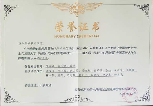 由深圳职业技术学院出品、深圳市名川传媒有限公司提供技术支持的微电影《远山的呼唤》荣获第五届“我心中的思政课”全国高校大学生微电影展示活动特等奖,并作为代表深圳市的三个学党史案例之一被选送参与全国职业院校党史学习教育成果展示活动,面向全国线上展示。