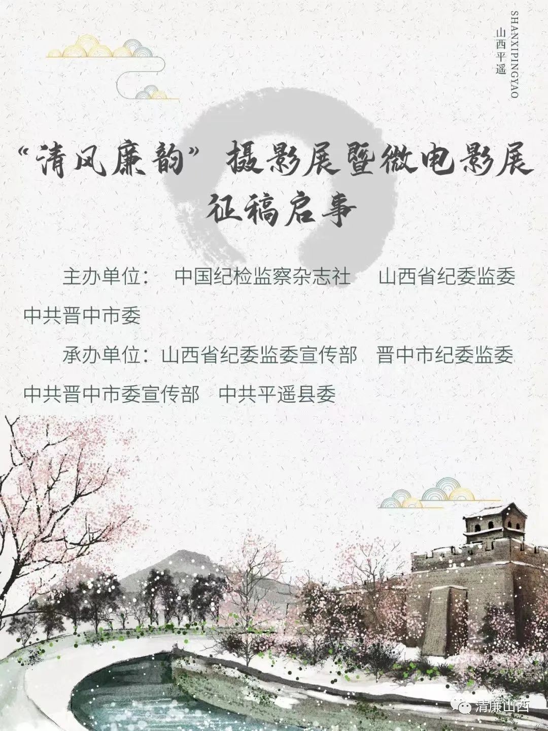 中国纪检监察杂志社、山西省纪委监委、中共晋中市委将于2022年9月联合主办“清风廉韵”摄影展暨微电影展,现面向全社会征集作品。