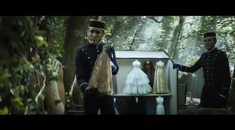 迪奥以微电影方式展示服装,工作人员将穿着新款时装的人偶拿给山林中的仙女挑选