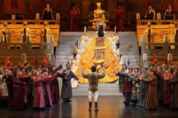作曲家普契尼创作的歌剧《图兰朵》,为意大利歌剧增添了令人耳目一新的东方风情,他用饱含深情的笔触为世人描绘了一个想象的中国传奇故事,其中的众多唱段传唱不衰,堪称经典,如恻动人心的衷情倾诉《主人,你听我说》,为爱疯狂的执迷不悟《柳儿,你别哭》,深情款款的呼唤《今夜无人入睡》等。剧中充满大量的中国元素,无论是唱词中多次出现的“北京城”“中国”“孔子”和十二生肖,还是不断重复的江苏民歌《茉莉花》的旋律,都会不时地带给观众无限的遐想与震撼。如果说《茉莉花》的唱段渲染了清远的东方情调,那么当卡拉夫王子唱起著名的咏叹调《今夜无人入睡》时,现场观众的心潮也随着动人的旋律一起徘徊、涤荡、久久难平。