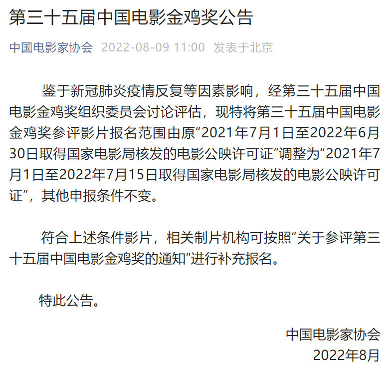8月9日,据中国电影家协会公告,第三十五届中国电影金鸡奖参评影片报名范围,由原“2021年7月1日至2022年6月30日取得国家电影局核发的电影公映许可证”调整为“2021年7月1日至2022年7月15日取得国家电影局核发的电影公映许可证”,其他申报条件不变。